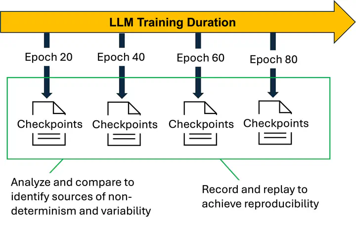 Reproducibility in distributed AI training is a crucial challenge due to several sources of uncertainty, including stragglers, data variability, and inherent randomness. Stragglers—slower processing nodes in a distributed system—can introduce timing discrepancies that affect the synchronization of model updates, leading to inconsistent states across training runs. Data variability, stemming from non-deterministic data shuffling and differing data partitions across nodes, can also lead to variations in model performance. Additionally, inherent randomness in algorithm initialization, such as random weight beginnings and stochastic processes like dropout, further compounds these challenges. Reproducibility in AI is pivotal for ensuring the credibility of AI-driven scientific findings, akin to how reproducibility underpins traditional scientific research.
