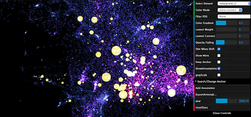 Novel timeline feature in which users can track the importance of certain words over time by watching the change in size of points (computes the IF-IDF metric for a word across all documents in a given year). Uses linear interpolation for years which do not have an explicit importance score.