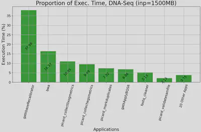 | Figure 1. Proportion of execution time for DNA Alignment applications, executed on Chameleon’s cascadelake_r node with 1500MB paired-end input. y-axis: proportion of application’s exec. time out of the whole workflow’s exec. time, x-axis: top 10 applications accounting for 97% exec. time, sorted by proportion. Other applications are aggregated. |